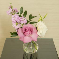 Beautify your reception table with a little floral display. Our small Alluring Blooms centerpieces are simple and elegant, perfect for capturing the mood of your reception. Arranged in a bulb vase the rose pairs wonderfully with the stock flowers, lisianthus, and ruscus. Pick the perfect color combo, this arrangement has an abundance of colors to chose from and match the entire Alluring Blooms Floral Collection. Minimum two (2) weeks notice required.