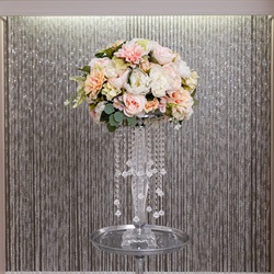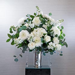 A dazzling altar spray for your unforgettable ceremony. Inspired by our 60th “Diamond” Anniversary, the Diamond Altar Spray features dangling crystal embellishments and sleek silver vase with an arrangement of hydrangeas, roses, mums, and greenery. You and your personal wedding planner will customize your ceremony décor by selecting a flower color scheme. Minimum 2-week’s notice for ordering this altar spray. Decorate your entire wedding day by adding the matching pew markers, bouquets, boutonnieres, and reception centerpieces from the Diamond Floral Collection.