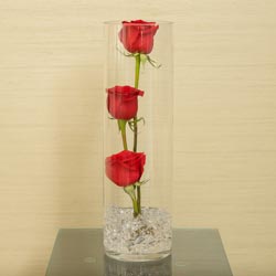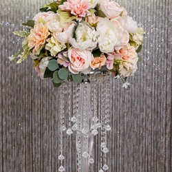 A beautiful centerpiece for the most special of days. This simple yet modern centerpiece is perfect for couples that are looking to add a pop of color to their celebration dinner table. Three roses will be submerged in water with crystal stones in a sleek glass vase. Roses are available in a variety of colors and additional décor features including wire wrap, rhinestone wrap, and LED are available to upgrade this stylish floral piece. Minimum two (2) weeks notice required.