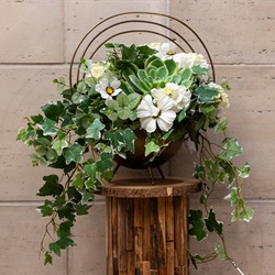 This fresh flower arrangement centerpiece for your rustic-inspired wedding adds a classic look and feel. This charming altar spray provides a touch elegance in our popular Glass Gardens chapel. Whimsical snapdragons, touches of ivy, and wax flowers are paired with fragrant roses that will complement your indoor garden ceremony. Additional color options are available through your wedding planner. Minimum two (2) weeks notice required.