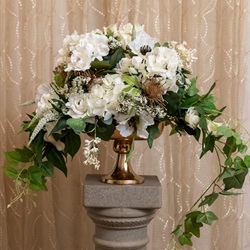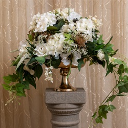 Beautiful blooms on your wedding day! A variety of textures and layers create this eye-catching altar spray. Delicate hydrangeas, dainty spray roses, and stock flowers make-up this appealing arrangement. Your assigned planner will help you with picking the perfect color scheme for your indoor garden wedding. Minimum two (2) weeks notice required.