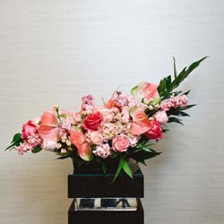 Blushing blooms for your ceremony décor. Your ceremony will reflect love and passion with our Besitos Altar Spray. This crescent-shaped altar spray is designed with exotic anthuriums, a variety of roses, stocks, and hydrangeas. Only available in pink hues. Minimum two (2) weeks notice required. Design a dazzling wedding flower scheme with the entire Besitos Floral Collection, including coordinating bouquets and boutonnieres to match this stunning arrangement.