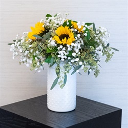 This vibrant centerpiece composed of sunflowers, baby’s breath, and greenery displays your floral arrangement in a chic white milk vase.