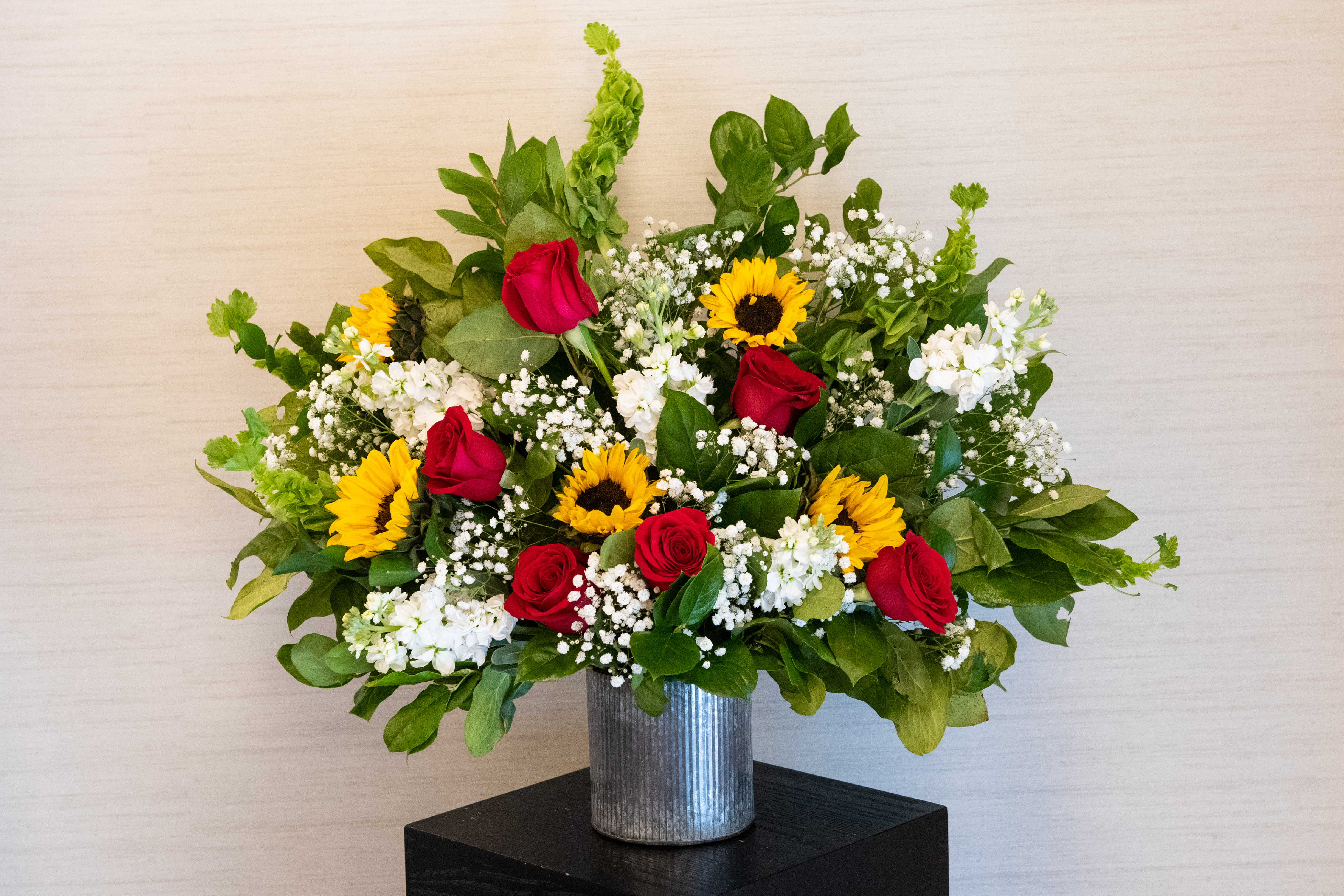 Embellish your Vegas wedding with this beautiful rustic arrangement made with roses which come in every color, sunflowers, seeded Eucalyptus, Baby’s Breath, Bells of Ireland, Greenery, and Fragrant Stock. This arrangement comes in a rustic tin vase. Minimum two (2) weeks notice required.