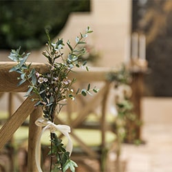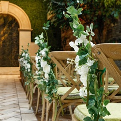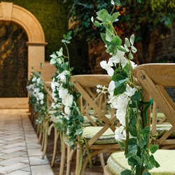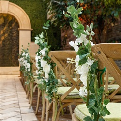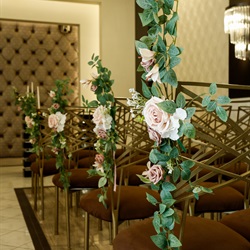 A touch of vintage. Hanging amaranthus, petite wax flowers, and enchanting eucalyptus will transform your wedding aisle to a romantic setting. These garden-fresh pew markers are available in any of our elegant wedding chapels. Minimum two (2) weeks notice required.