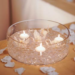 A shimmering centerpiece for your romantic reception. You will set the mood with our Diamond Floating Centerpiece. This rental centerpiece features our low-profile vase filled with gems, mini cymbidium orchids (available in a variety of colors), and floating candles. Minimum 2-week’s notice for ordering this centerpiece. Plan your floral theme for your entire wedding by adding the matching bouquets, ceremony décor, and boutonnieres from the Diamond Floral Collection.