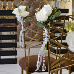 Adorn your ceremony in crystals. The Diamond Décor Package with Pew Markers combines (2) Diamond Altar Sprays with (6) Diamond Pew Markers and rose petals for the aisle to create a gorgeous setting for your ceremony. You will get to pick your flower colors with your wedding planner. Minimum 2-week’s notice for ordering this floral décor package. Complete your floral scheme by adding on the matching bouquets, boutonnieres, and reception décor from the Diamond Floral Collection.