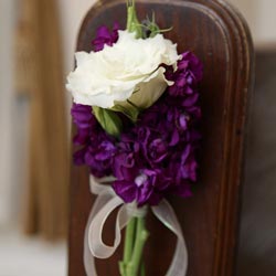 Stage your perfect entrance and add trend-setting style to your wedding aisle with our Alluring Blooms pew markers. Your aisle will be lined with rose, freesia, stock, ruscus, and long strands of ribbon in your desired color scheme. Price is listed is for a single pew marker, and a minimum of 2 markers is required. Let your love bloom with the complete Alluring Blooms Floral Collection, which includes: bridal bouquet, boutonnieres, bridal party arrangements, and ceremony/reception floral décor for your wedding day. Minimum two (2) weeks notice required.
