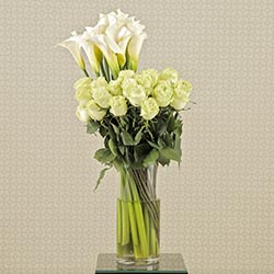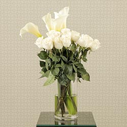 Sophisticated and beautiful. Twelve blooming rose buds are arranged amongst exquisite calla lilies to create a lovely statement piece for your ceremony altar. Available in a variety of color schemes, which your wedding planner can help you arrange. Minimum two (2) weeks notice required.