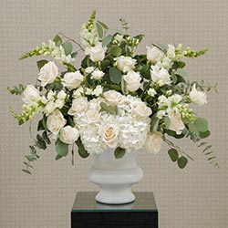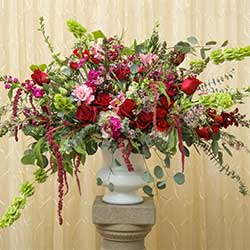 Full and fragrant, this over-sized Romantic Altar display will add an amazing backdrop to your Chapel ceremony. Assorted with a luxurious selection of garden-fresh flowers including: delicate hydrangeas, stocks of Bells of Ireland, and classic roses. You and your planner will customize this altar spray with your wedding colors. Minimum two (2) weeks notice required.