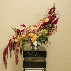 Love and Passion – your wedding flowers will set a romantic mood for your ceremony. The Simply Chic Altar Spray blends a variety of blooms from soft layers of astilbe, hanging amaranthus, and hydrangeas to blossoming roses, pom mums, and snapdragons with accenting thistles, curly willows, and greenery. Design a complete wedding look by ordering the entire Simply Chic Floral Collection with coordinating bridal bouquet, boutonnieres, bridal party arrangements, and ceremony/reception floral décor for your wedding day. Minimum two (2) weeks notice required.