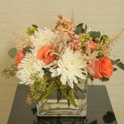 An enchanting floral arrangement for your wedding reception. The Simply Chic centerpiece is trendy with playful mums and sweet roses complemented with stocks and seeded eucalyptus greenery. Make your entire wedding match by ordering the entire Simply Chic Floral Collection with coordinating bridal bouquet, boutonnieres, bridal party arrangements, and ceremony/reception floral décor for your wedding day. Minimum two (2) weeks notice required.