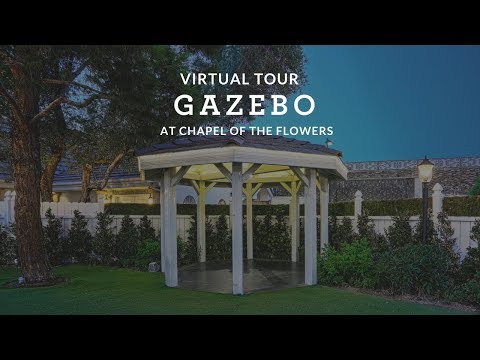 Picture perfect, this charming gazebo is nestled under the trees and surrounded by lush greenery. Crystals adorn the ceiling of this intimate space, and after dark, it is beautifully illuminated. The gazebo is a popular location for wedding photos and is also ideal for a small Las Vegas ceremony, with guest seating set up on the adjacent lawn.