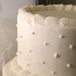 A simple cake for an intimate celebration! This single-tier wedding cake is decorated with elegant icing dots or whimsical icing swirls and serves 4-8. Splendid Cakes will have choice of cake shape, flavor, filling and upgraded bling ribbon. The cake will be delivered to the Chapel to take with you after your ceremony. (Wedding planner can arrange for delivery to hotel or reception venue, additional fee will apply)