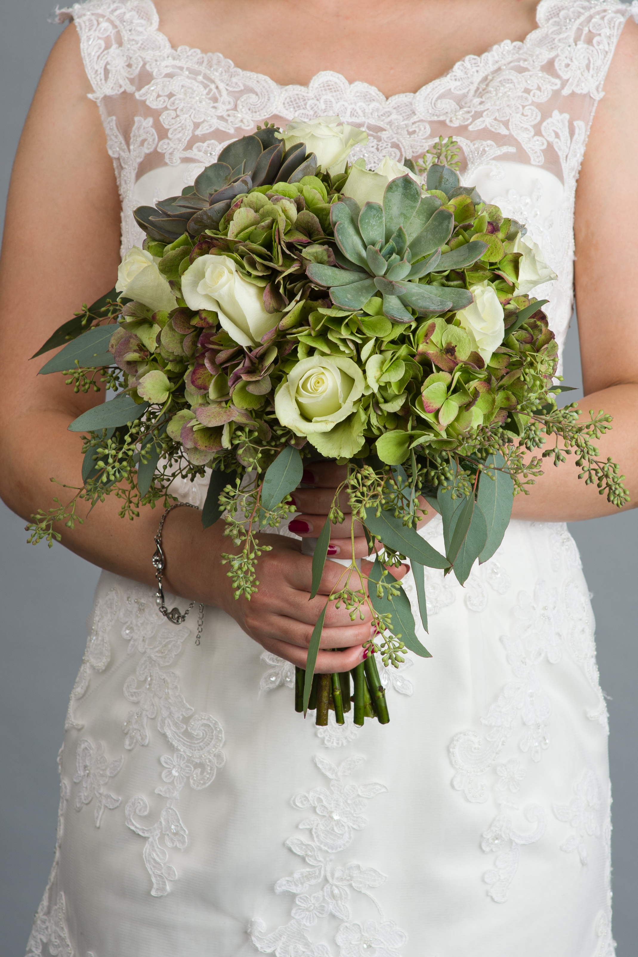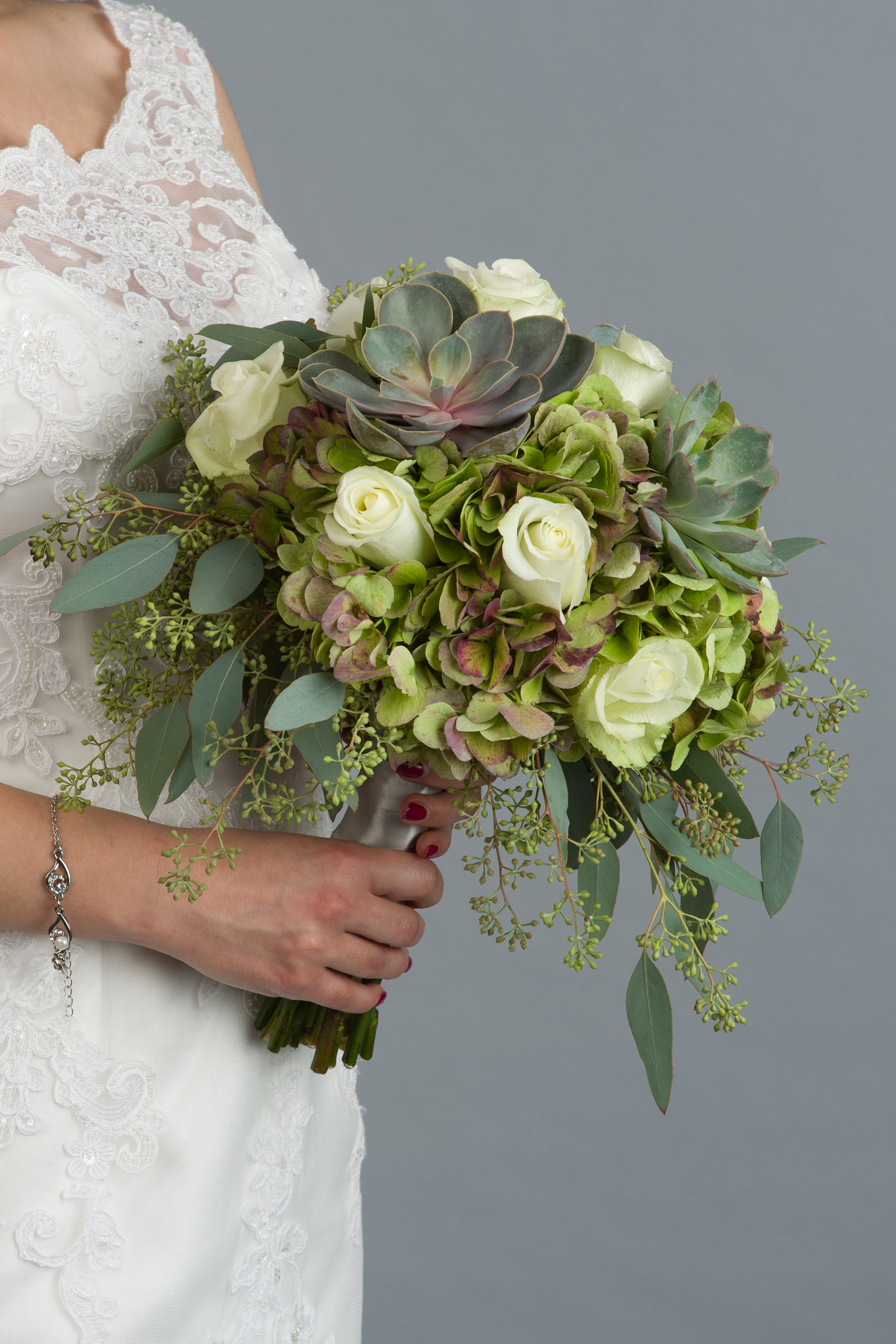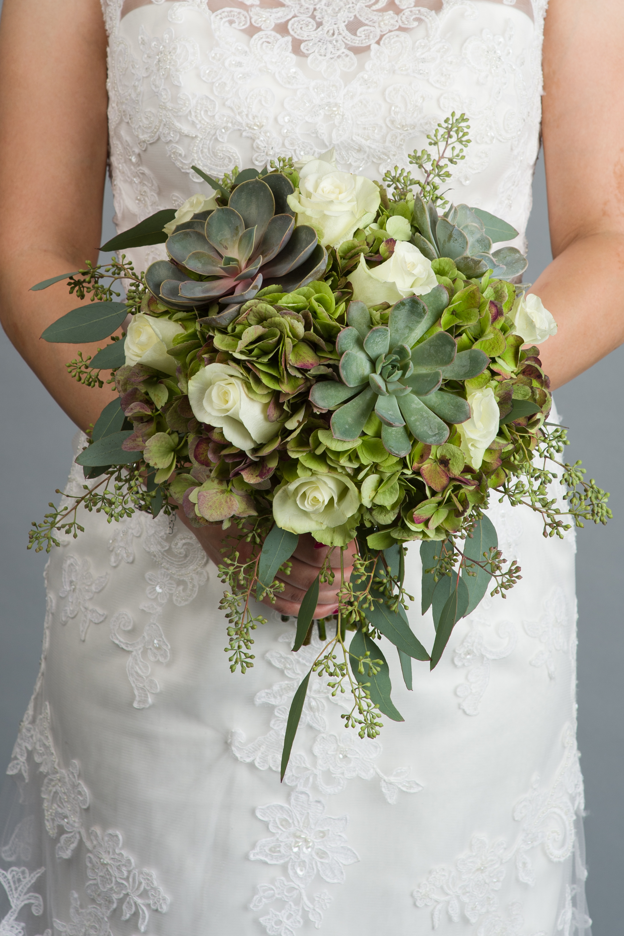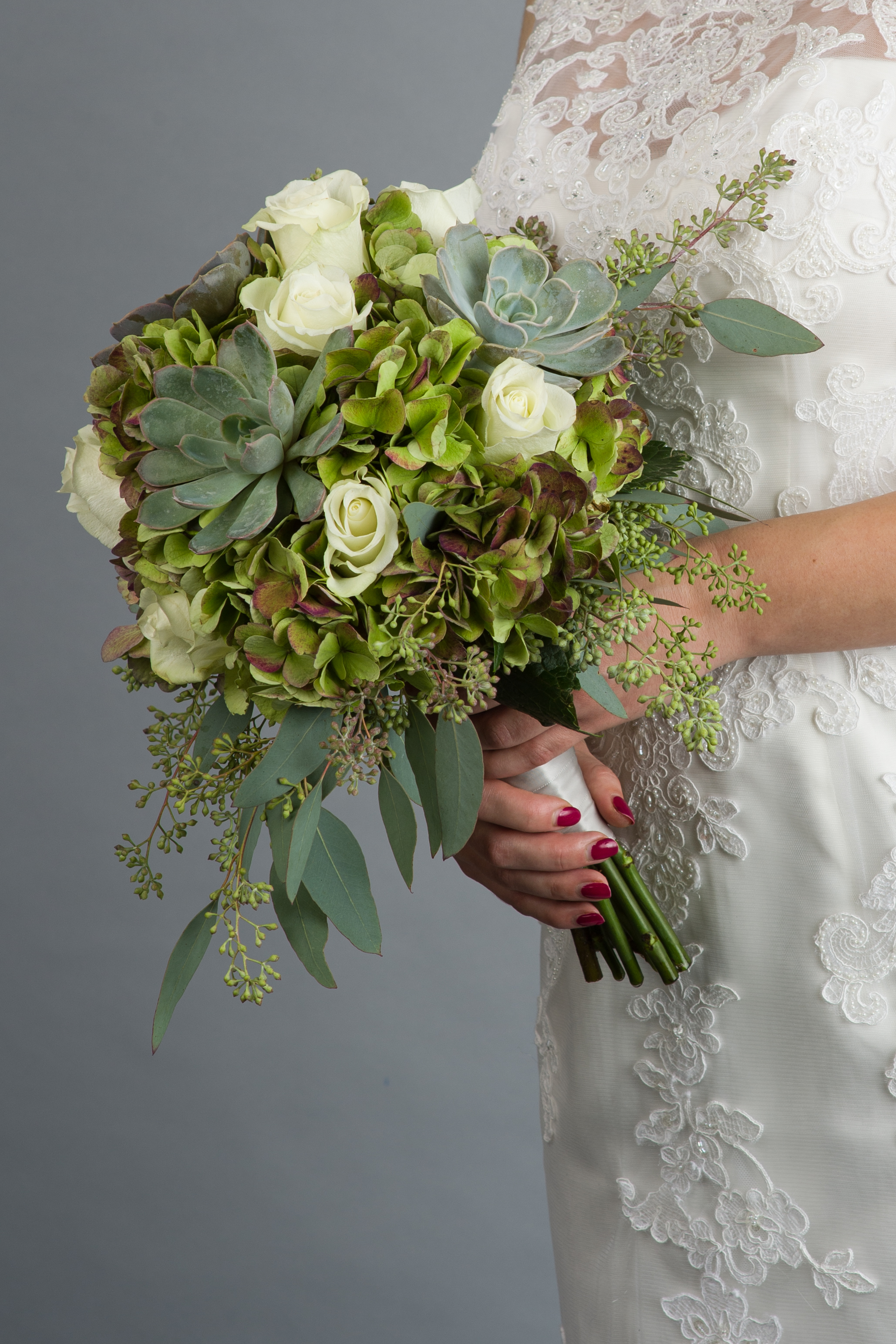 Greenery galore! Freshly picked succulents, hydrangeas, and roses in appealing green tones will give you a stunning look on your wedding day. This bouquet requires minimum two weeks notice.