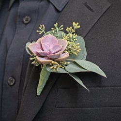 Look sharp with our Succulent Boutonniere. This eye-catching boutonniere pairs a succulent with greenery for a divine look. Minimum two (2) weeks notice required. Please note: this boutonniere must be ordered with a bouquet or other wedding floral arrangements that feature succulents.
