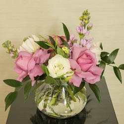 Beautify your reception table with a little floral display. Our small Alluring Blooms centerpieces are simple and elegant, perfect for capturing the mood of your reception. Arranged in a bulb vase the rose pairs wonderfully with the stock flowers, lisianthus, and ruscus. Pick the perfect color combo, this arrangement has an abundance of colors to chose from and match the entire Alluring Blooms Floral Collection. Minimum two (2) weeks notice required.