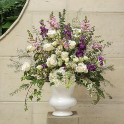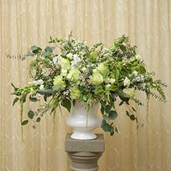 The new classic look. Our Lovely Altar Spray gives you a traditional ambiance with blossoming roses, while paired with modern greenery for that popular “freshly-picked” look. Available in a variety of color schemes. Minimum two (2) weeks notice required.